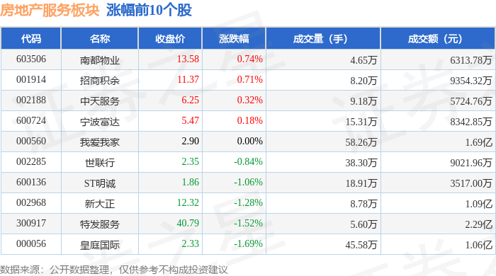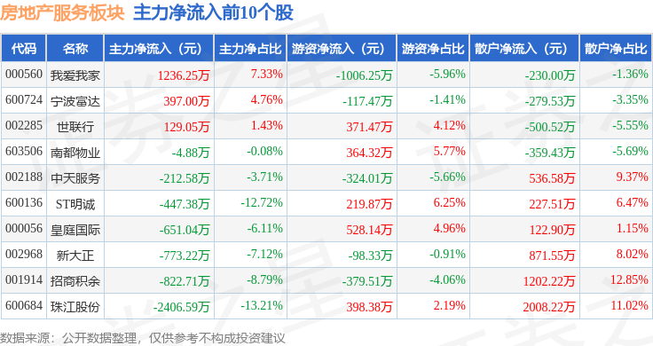 从资金流向上来看,当日房地产服务板块主力资金净流出6240.22万元,游资资金净流入458.0万元,散户资金净流入5782.22万元。房地产服务板块个股资金流向见下表: