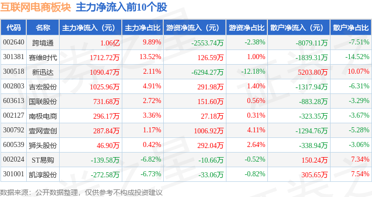 从资金流向上来看,当日互联网电商板块主力资金净流入7049.67万元,游资资金净流出6829.24万元,散户资金净流出220.43万元。互联网电商板块个股资金流向见下表: