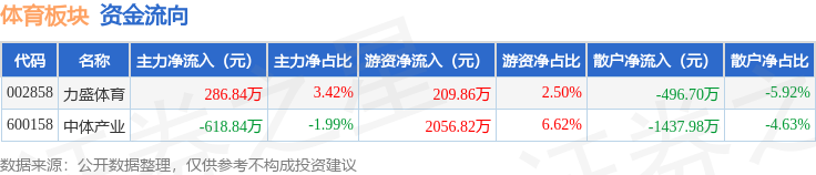 从资金流向上来看,当日体育板块主力资金净流出332.0万元,游资资金净流入2266.69万元,散户资金净流出1934.68万元。体育板块个股资金流向见下表: