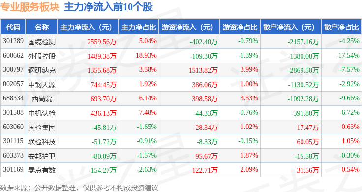 从资金流向上来看,当日专业服务板块主力资金净流出2.02亿元,游资资金净流入7908.01万元,散户资金净流入1.22亿元。专业服务板块个股资金流向见下表: