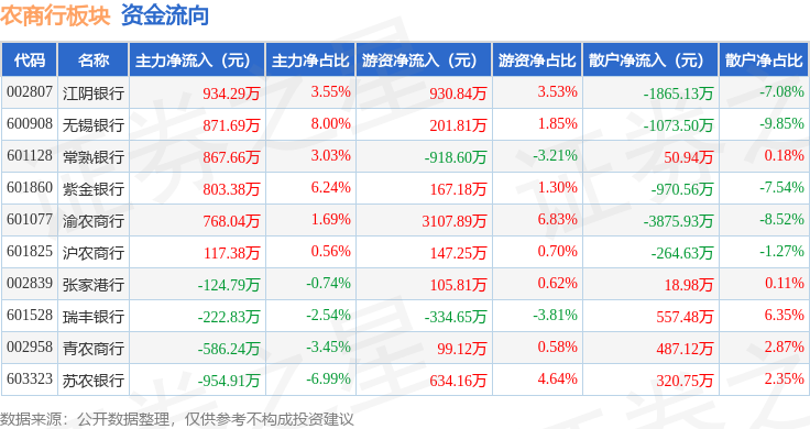 从资金流向上来看,当日农商行板块主力资金净流入2473.66万元,游资资金净流入4140.82万元,散户资金净流出6614.48万元。农商行板块个股资金流向见下表:
