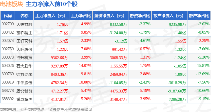 从资金流向上来看,当日电池板块主力资金净流出17.38亿元,游资资金净流入8.73亿元,散户资金净流入8.64亿元。电池板块个股资金流向见下表: