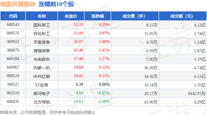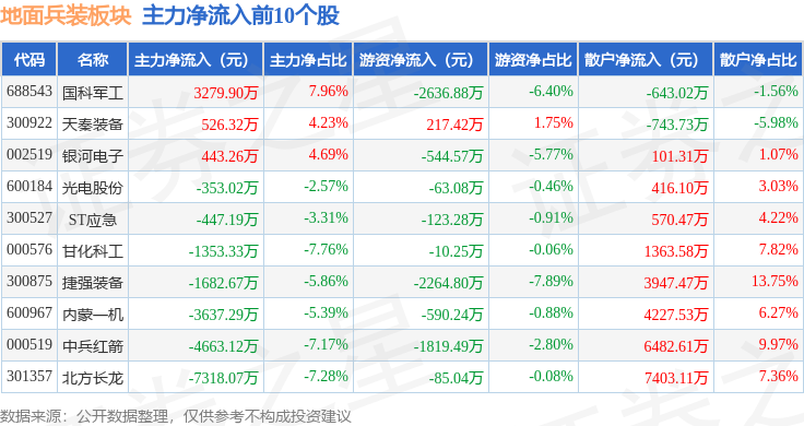 从资金流向上来看,当日地面兵装板块主力资金净流出4.92亿元,游资资金净流出571.37万元,散户资金净流入4.98亿元。地面兵装板块个股资金流向见下表: