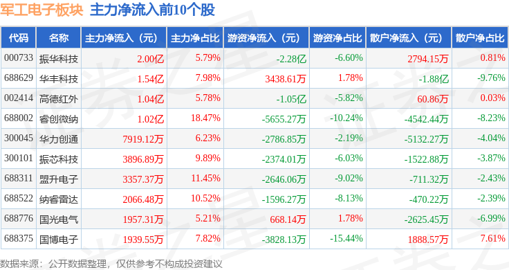 从资金流向上来看,当日军工电子板块主力资金净流入1.15亿元,游资资金净流出5.77亿元,散户资金净流入4.61亿元。军工电子板块个股资金流向见下表: