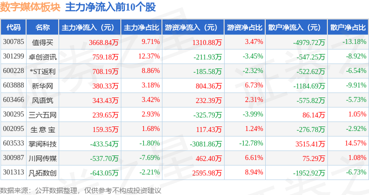 从资金流向上来看,当日数字媒体板块主力资金净流出1344.39万元,游资资金净流入1106.62万元,散户资金净流入237.77万元。数字媒体板块个股资金流向见下表:
