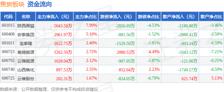 从资金流向上来看,当日焦炭板块主力资金净流入1.34亿元,游资资金净流出4066.28万元,散户资金净流出9352.48万元。焦炭板块个股资金流向见下表: