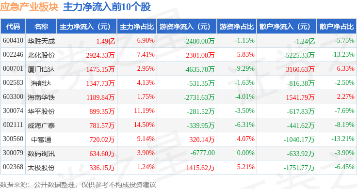 从资金流向上来看,当日应急产业板块主力资金净流入4451.07万元,游资资金净流出2.0亿元,散户资金净流入1.55亿元。应急产业板块个股资金流向见下表: