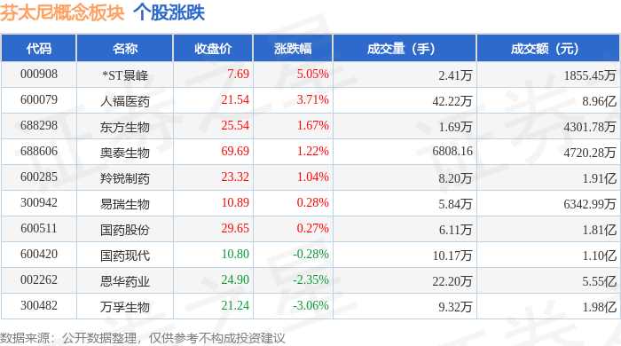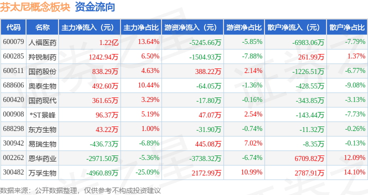 从资金流向上来看,当日芬太尼概念板块主力资金净流入6934.67万元,游资资金净流出7549.3万元,散户资金净流入614.63万元。芬太尼概念板块个股资金流向见下表: