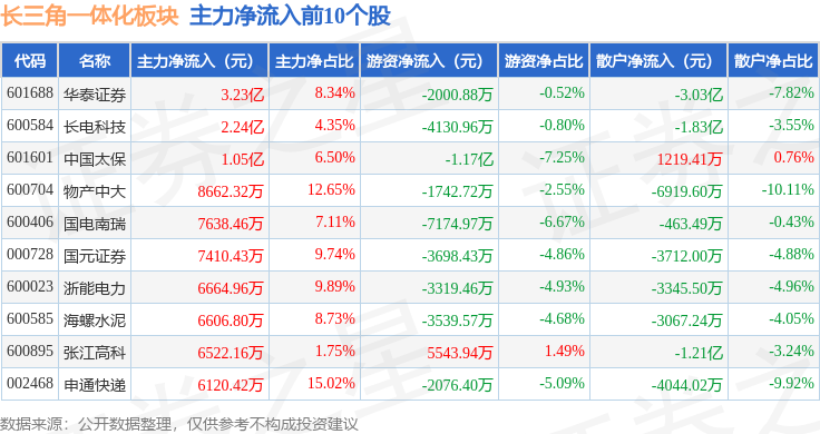 从资金流向上来看,当日长三角一体化板块主力资金净流出26.53亿元,游资资金净流入5.77亿元,散户资金净流入20.76亿元。长三角一体化板块个股资金流向见下表: