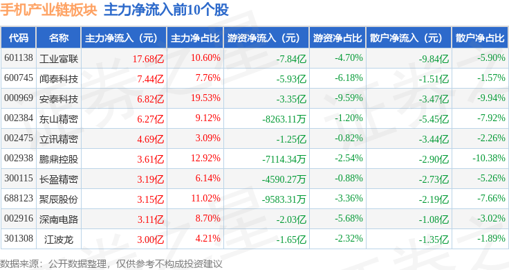 从资金流向上来看,当日手机产业链板块主力资金净流入49.47亿元,游资资金净流出28.24亿元,散户资金净流出21.23亿元。手机产业链板块个股资金流向见下表:
