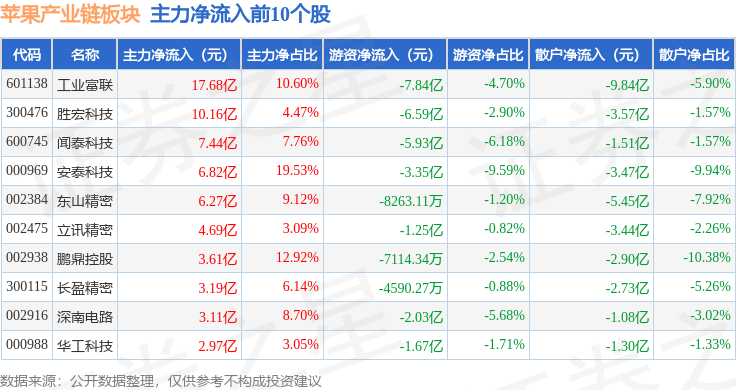 从资金流向上来看,当日苹果产业链板块主力资金净流入59.27亿元,游资资金净流出32.01亿元,散户资金净流出27.26亿元。苹果产业链板块个股资金流向见下表: