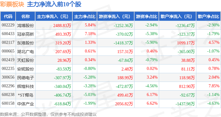 从资金流向上来看,当日彩票板块主力资金净流出6386.32万元,游资资金净流出937.09万元,散户资金净流入7323.42万元。彩票板块个股资金流向见下表: