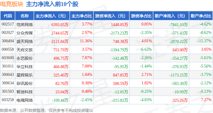 从资金流向上来看,当日电竞板块主力资金净流出12.82亿元,游资资金净流入3.88亿元,散户资金净流入8.95亿元。电竞板块个股资金流向见下表:
