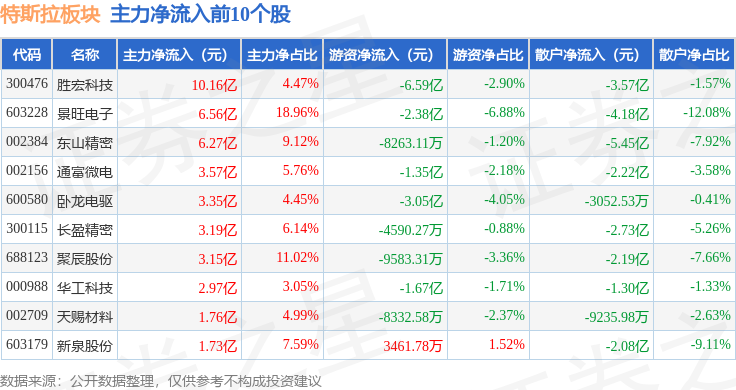 从资金流向上来看,当日特斯拉板块主力资金净流入9.38亿元,游资资金净流入3815.45万元,散户资金净流出9.76亿元。特斯拉板块个股资金流向见下表: