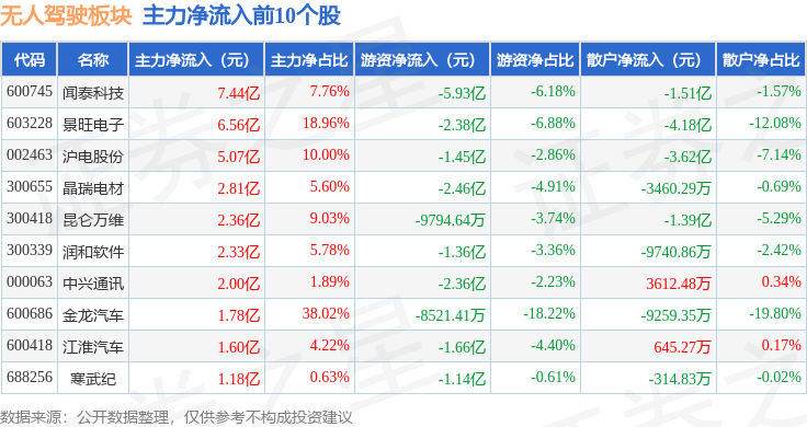 从资金流向上来看,当日无人驾驶板块主力资金净流入4.55亿元,游资资金净流出14.05亿元,散户资金净流入9.5亿元。无人驾驶板块个股资金流向见下表:
