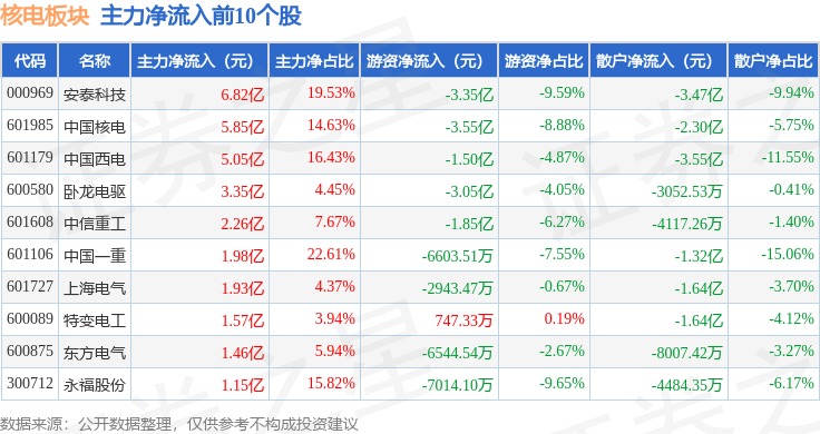 从资金流向上来看,当日核电板块主力资金净流入20.82亿元,游资资金净流出13.41亿元,散户资金净流出7.41亿元。核电板块个股资金流向见下表: