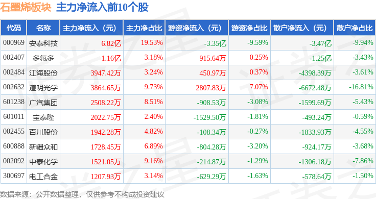 从资金流向上来看,当日石墨烯板块主力资金净流出6.32亿元,游资资金净流入6740.28万元,散户资金净流入5.65亿元。石墨烯板块个股资金流向见下表: