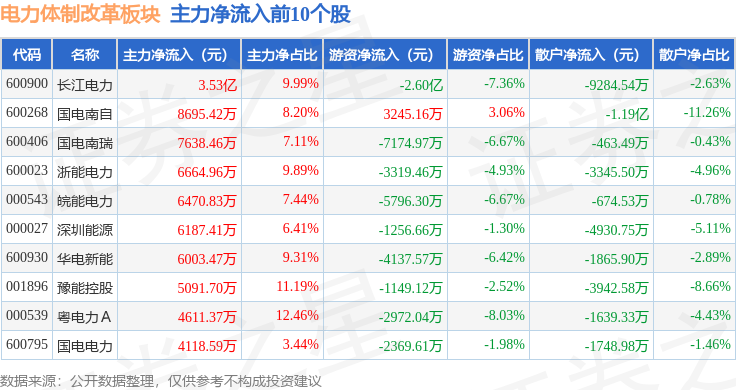 从资金流向上来看,当日电力体制改革板块主力资金净流入5.41亿元,游资资金净流出6.92亿元,散户资金净流入1.51亿元。电力体制改革板块个股资金流向见下表: