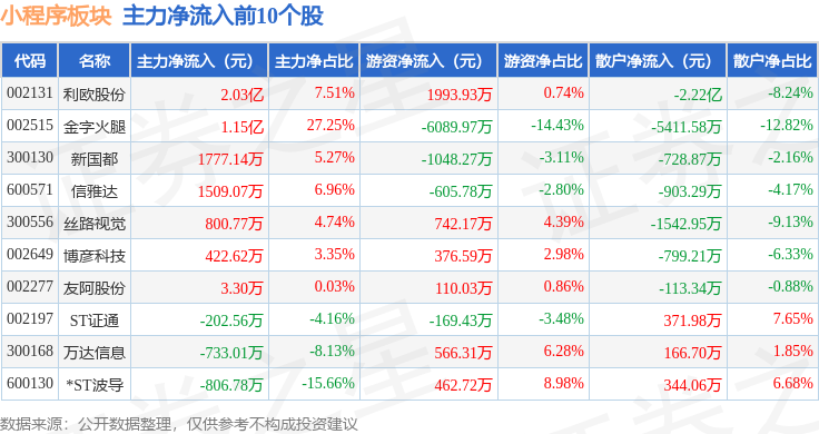 从资金流向上来看,当日小程序板块主力资金净流入2.12亿元,游资资金净流出3893.25万元,散户资金净流出1.73亿元。小程序板块个股资金流向见下表: