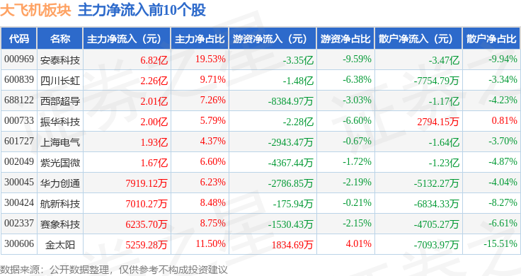 从资金流向上来看,当日大飞机板块主力资金净流出1.42亿元,游资资金净流出5.36亿元,散户资金净流入6.79亿元。大飞机板块个股资金流向见下表: