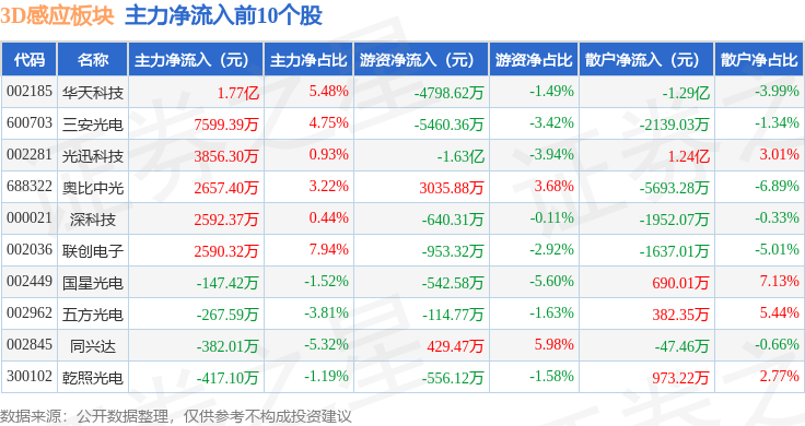 从资金流向上来看,当日3D感应板块主力资金净流出1.6亿元,游资资金净流出3.61亿元,散户资金净流入5.21亿元。3D感应板块个股资金流向见下表: