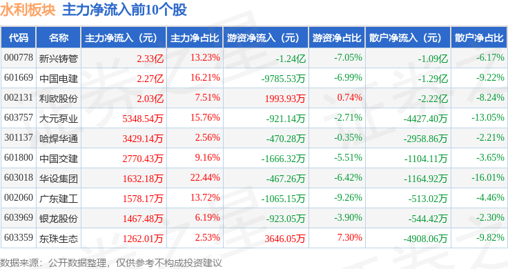 从资金流向上来看,当日水利板块主力资金净流出5.69亿元,游资资金净流入2.23亿元,散户资金净流入3.46亿元。水利板块个股资金流向见下表: