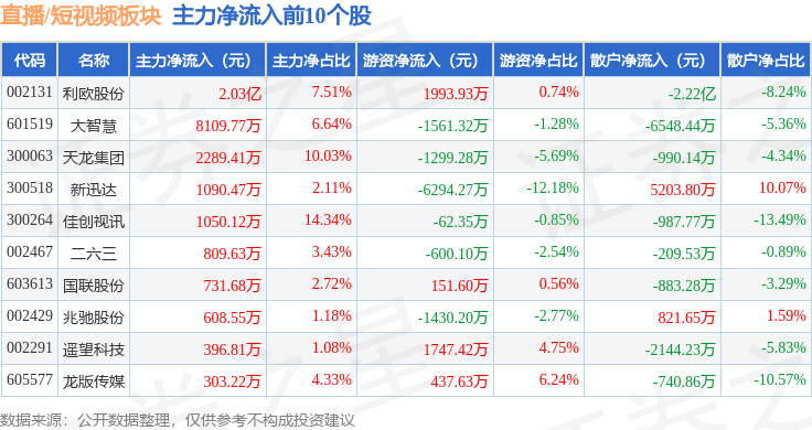 从资金流向上来看,当日直播/短视频板块主力资金净流出7463.55万元,游资资金净流出5718.18万元,散户资金净流入1.32亿元。直播/短视频板块个股资金流向见下表:
