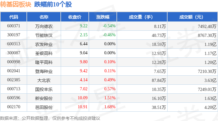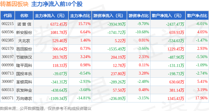 从资金流向上来看,当日转基因板块主力资金净流入5556.07万元,游资资金净流出6607.54万元,散户资金净流入1051.47万元。转基因板块个股资金流向见下表: