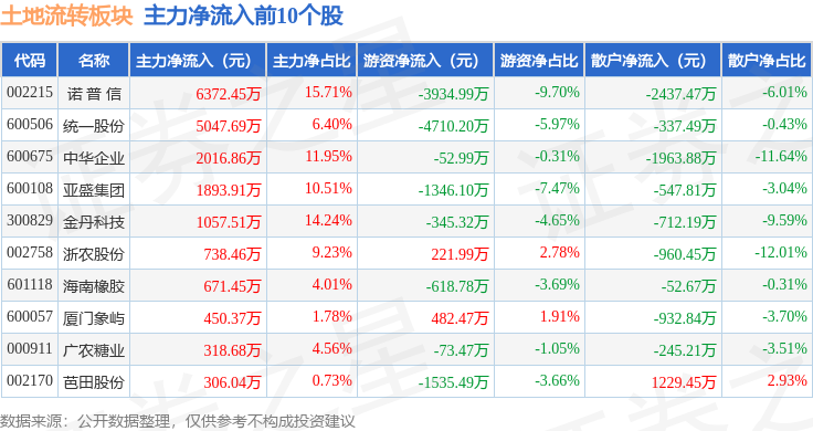 从资金流向上来看,当日土地流转板块主力资金净流出1.0亿元,游资资金净流出6889.52万元,散户资金净流入1.69亿元。土地流转板块个股资金流向见下表: