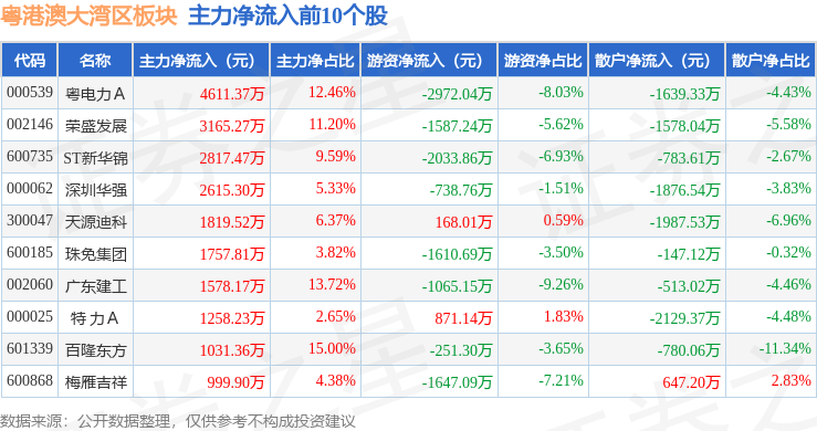 从资金流向上来看,当日粤港澳大湾区板块主力资金净流出14.2亿元,游资资金净流入2.48亿元,散户资金净流入11.72亿元。粤港澳大湾区板块个股资金流向见下表: