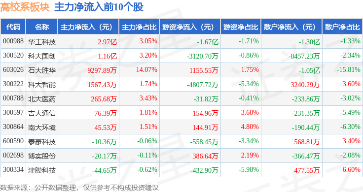 从资金流向上来看,当日高校系板块主力资金净流入3.34亿元,游资资金净流出1.88亿元,散户资金净流出1.46亿元。高校系板块个股资金流向见下表: