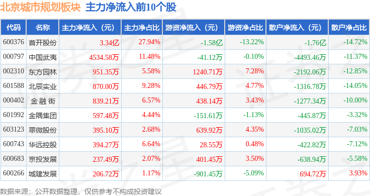 从资金流向上来看,当日北京城市规划板块主力资金净流入3.42亿元,游资资金净流出9044.69万元,散户资金净流出2.52亿元。北京城市规划板块个股资金流向见下表: