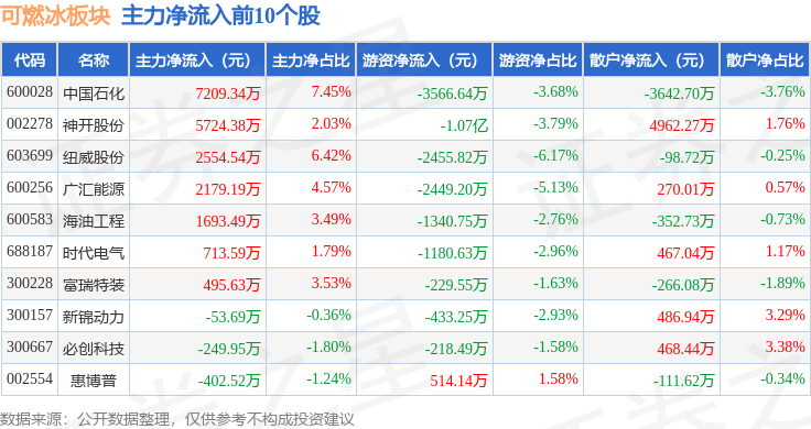从资金流向上来看,当日可燃冰板块主力资金净流出3.91亿元,游资资金净流出1.57亿元,散户资金净流入5.48亿元。可燃冰板块个股资金流向见下表: