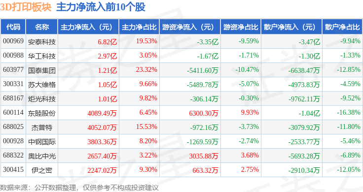 从资金流向上来看,当日3D打印板块主力资金净流入8.47亿元,游资资金净流出5.26亿元,散户资金净流出3.21亿元。3D打印板块个股资金流向见下表: