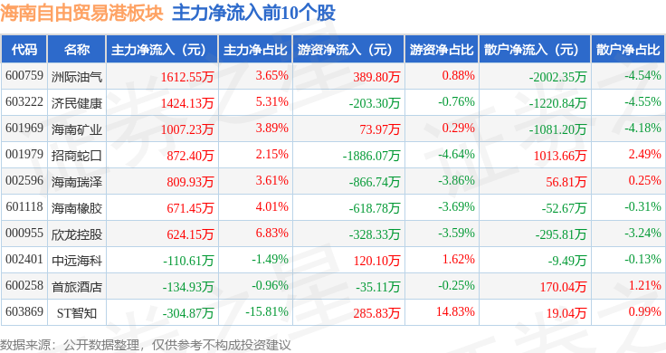 从资金流向上来看,当日海南自由贸易港板块主力资金净流出7.01亿元,游资资金净流入1.03亿元,散户资金净流入5.98亿元。海南自由贸易港板块个股资金流向见下表: