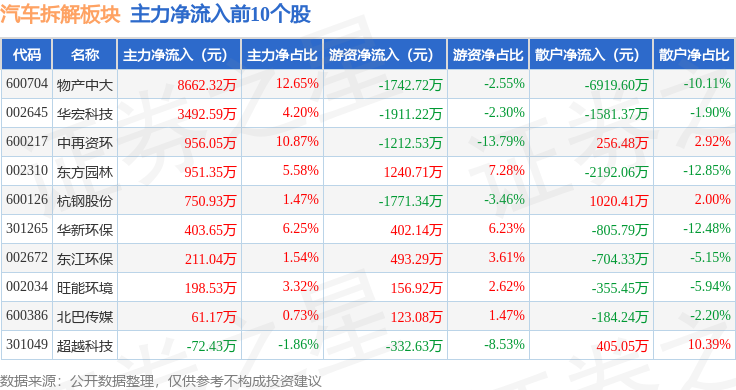 从资金流向上来看,当日汽车拆解板块主力资金净流入1.25亿元,游资资金净流出786.0万元,散户资金净流出1.17亿元。汽车拆解板块个股资金流向见下表: