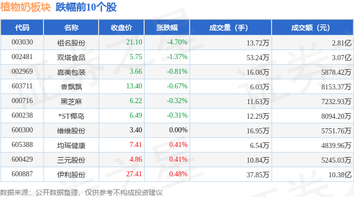 从资金流向上来看,当日植物奶板块主力资金净流入2756.28万元,游资资金净流出517.87万元,散户资金净流出2238.41万元。植物奶板块个股资金流向见下表: