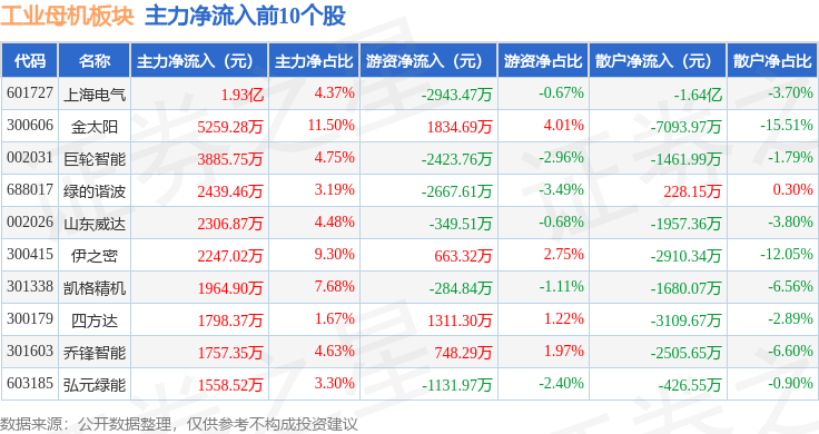 从资金流向上来看,当日工业母机板块主力资金净流出3.79亿元,游资资金净流出3677.48万元,散户资金净流入4.16亿元。工业母机板块个股资金流向见下表: