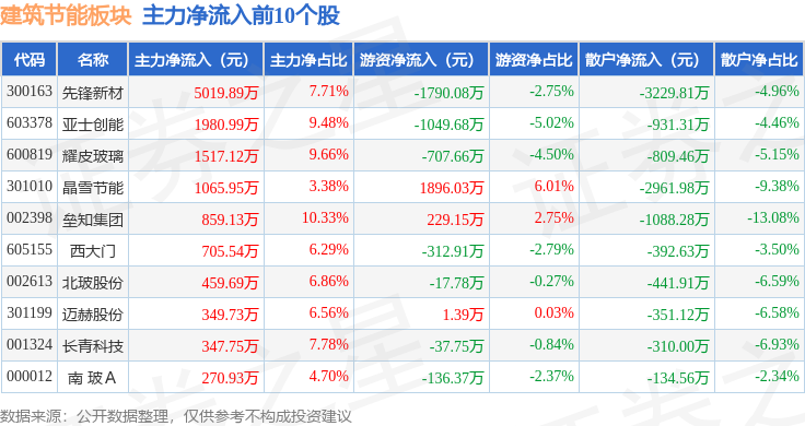 从资金流向上来看,当日建筑节能板块主力资金净流出6100.46万元,游资资金净流入9928.0万元,散户资金净流出3827.54万元。建筑节能板块个股资金流向见下表: