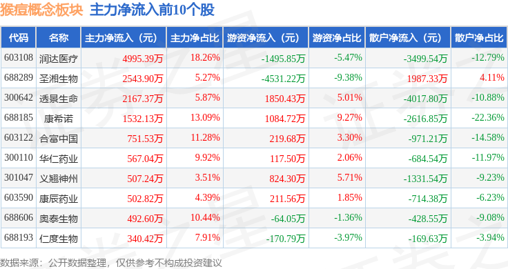 从资金流向上来看,当日猴痘概念板块主力资金净流出1.59亿元,游资资金净流入6271.75万元,散户资金净流入9580.01万元。猴痘概念板块个股资金流向见下表: