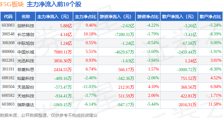从资金流向上来看,当日F5G板块主力资金净流入10.3亿元,游资资金净流出6.34亿元,散户资金净流出3.96亿元。F5G板块个股资金流向见下表: