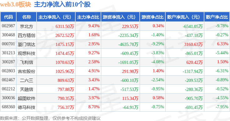 从资金流向上来看,当日web3.0板块主力资金净流出1.25亿元,游资资金净流出1.41亿元,散户资金净流入2.65亿元。web3.0板块个股资金流向见下表: