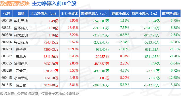 从资金流向上来看,当日数据要素板块主力资金净流出1.8亿元,游资资金净流入3739.66万元,散户资金净流入1.43亿元。数据要素板块个股资金流向见下表: