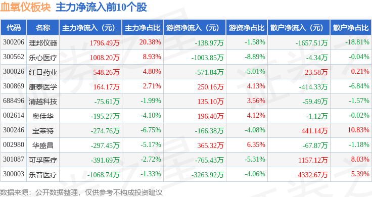 从资金流向上来看,当日血氧仪板块主力资金净流出1.81亿元,游资资金净流出8747.74万元,散户资金净流入2.68亿元。血氧仪板块个股资金流向见下表: