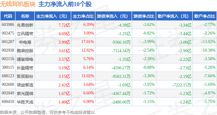 从资金流向上来看,当日无线耳机板块主力资金净流入11.67亿元,游资资金净流出6.93亿元,散户资金净流出4.74亿元。无线耳机板块个股资金流向见下表: