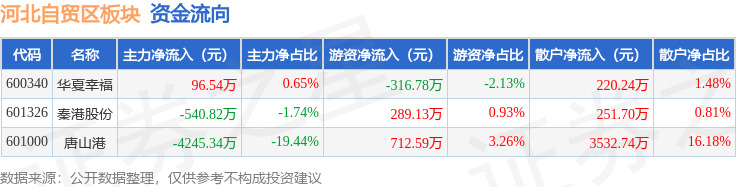 从资金流向上来看,当日河北自贸区板块主力资金净流出4689.62万元,游资资金净流入684.94万元,散户资金净流入4004.68万元。河北自贸区板块个股资金流向见下表: