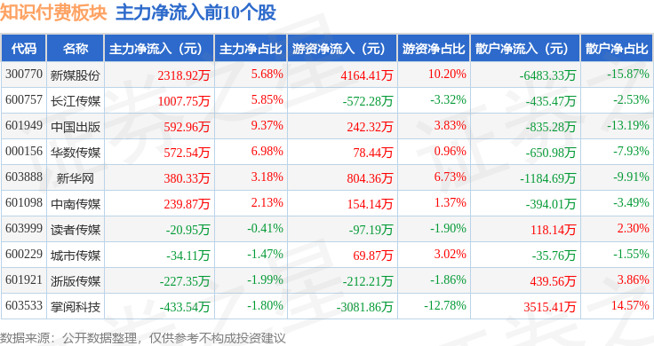 从资金流向上来看,当日知识付费板块主力资金净流出3.68亿元,游资资金净流出6778.87万元,散户资金净流入4.36亿元。知识付费板块个股资金流向见下表: