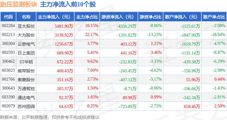 从资金流向上来看,当日胎压监测板块主力资金净流出2.04亿元,游资资金净流入6773.86万元,散户资金净流入1.36亿元。胎压监测板块个股资金流向见下表: