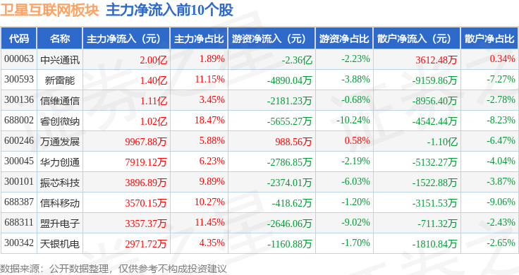 从资金流向上来看,当日卫星互联网板块主力资金净流出13.0亿元,游资资金净流出2.19亿元,散户资金净流入15.19亿元。卫星互联网板块个股资金流向见下表: