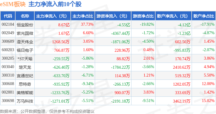 从资金流向上来看,当日eSIM板块主力资金净流入9.32亿元,游资资金净流出4.93亿元,散户资金净流出4.39亿元。eSIM板块个股资金流向见下表: